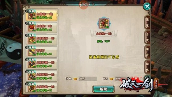 当您在畅游《破天一剑》为您创造的武侠世界时,装备自然是闯荡江湖不可或缺的,辛苦升级的装备如果不能绑定,是不是会有一些缺乏安全感呢?在新版本中,游戏加入了装备绑定与解绑的机制,当玩家使用绑定材料对装备进行强化时,会出现一个装备绑定的提示,点击确定即可将装备的状态变为绑定状态。