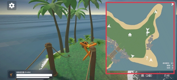 6、通过跳跃快速到达另外一座小岛,获取新的图案或身体部位,你还可以点击右上方的地图查看自己所在的位置,下面就是继续寻找新的四肢来捏造生物啦。