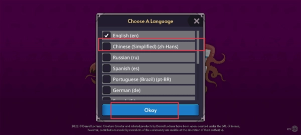 1、启动游戏后,界面上的内容都是英文显示,此时点击右下角带有“en”字样的地球图标即可。