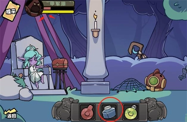 1、游戏开局会给许多道具,先看到三瓶不同颜色的【药水】,点击【蓝色的药水】,防止眩晕。