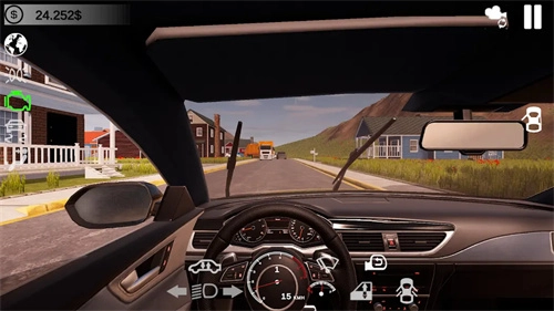 3、游戏以第一人称视角的形式展现,通过滑动屏幕操作方向盘,不同的车辆功能操作也需要点击对应车内布置进行互动;
