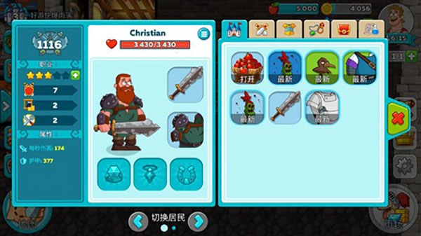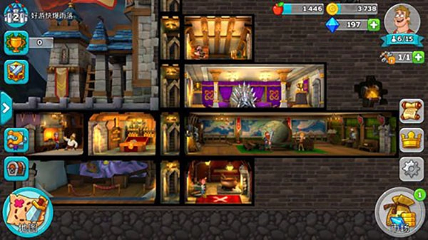 4、我们还可以点击城堡中的角色,将背包中的装备佩戴在他们身上,不过大家要注意,有一些特殊装备只能佩戴给固定角色。例如铠甲只能佩戴给坦克、法杖只能给法师等等,而且这些装备都能有效的增加该特殊角色的属性。当资金足够的时候,可以点击右下角的市场,增加新的房间。我们可以建造的房间分为生产类、训练类、支援类、宝藏类、混杂类等。
