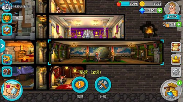 5、需要什么样的基地功能,就建造怎么用的房间即可。例如训练室可以提升自己士兵的攻击力,直接将士兵拖放到训练室即可。当军营等级提升后,我们可以招募更多士兵,这样就能在后面的战斗中拥有更多战斗力。这样基本上前期就能站住脚了,接下来就是不断的冒险挑战,获取更多资源来提升自己的城堡基地了,总有一天我们可以有实力与恶龙一较高下。