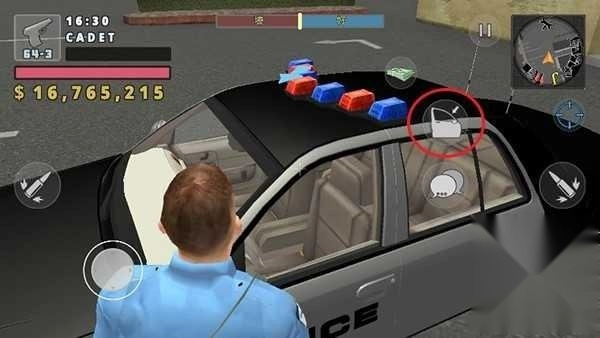 玩家到停车房可以进行车辆的驾驶,靠近车辆点击车门图标即可开始驾驶,此时玩家就可以去街上寻找罪犯并且将他们逮捕。