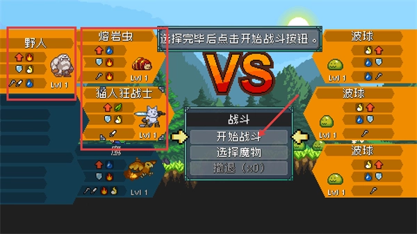 1、挑选【野人】【熔岩虫】这类Lv1的魔物,点击【开始战斗】按钮开启对战,借助低等级魔物来积累战斗经验。