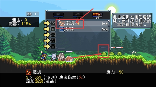 2、战斗中使用【燃烧】技能,可对敌方施加减益效果并造成魔法伤害,搭配连击机制提升输出效率。