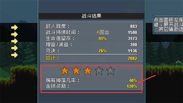 4、战斗胜利后可获得【40%-稀有掉落几率】与【120%-金钱奖励】,高评价结算能提升资源获取收益。