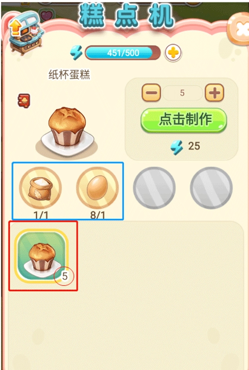 2、制作甜品:红框是我们已有的甜品种类以及数量,蓝框是制作一次需要用到的原材料。每一次制作都会消耗一定的机器能量(机器能量是按每台机器单独计算,不共享的,也就是机器越多,我们制作的频率也就越快)