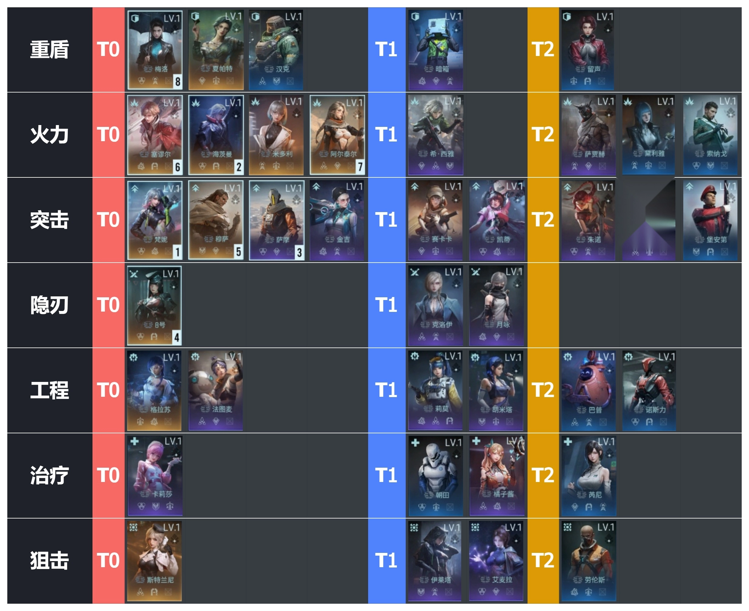 8、8号(隐刃)单攻的隐匿型刺客,可在场上长时间存活攻击,跟暴击高的队友搭配时,单体伤害非常可观;但不推荐作为核心角色选取。