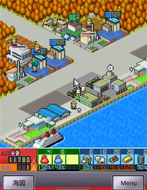 右下角则是用于打开菜单栏的按钮。图中建筑物从左往右,土黄色的是农田,左边第一栋白色建筑物是研究所,蓝色的是储存仓库,绿色的是商品仓库,有烟筒的是工厂,最上面那个是商店, 左下角的是民用码头,有蓝色仓库的是工业码头,有雷达/吉普车的是军用码头。