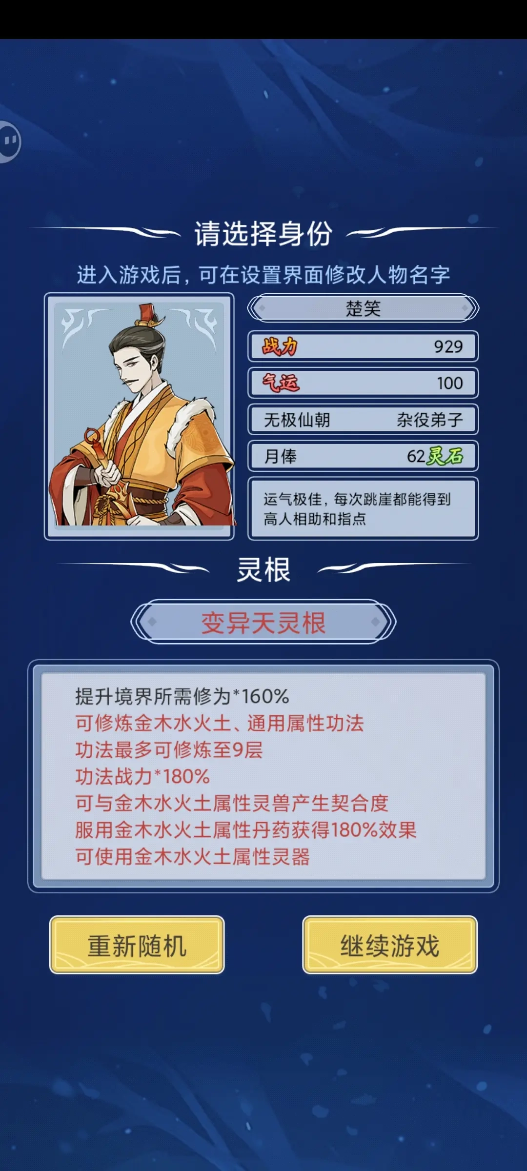 变异、天灵根优先,气运需90以上。