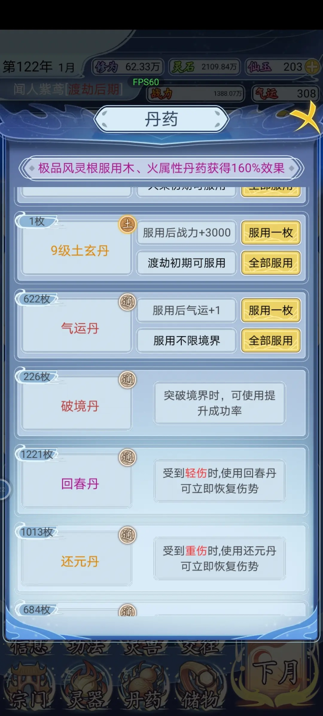 紫药材(102概率),橙药材(222概率),红药材(582概率)。气运丹提升气运,紫药可炼气运丹。