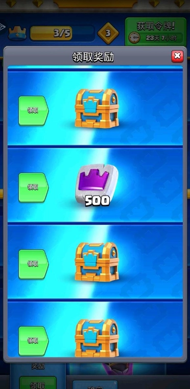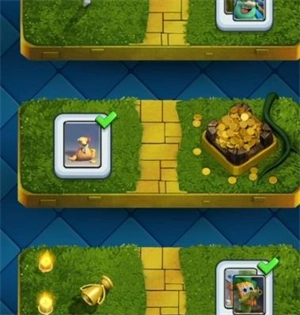 获胜的一方将会获得金币,宝箱以及奖杯作为奖励,失败的一方将不会获得任何奖励并且扣除一定数量的奖杯,玩家可以获得奖杯以前往更高等级的竞技场(段位)。宝箱经过一段时间的解锁可以开出金币,钻石,卡牌等物品,不同种类的宝箱会开到不同数量的物品。