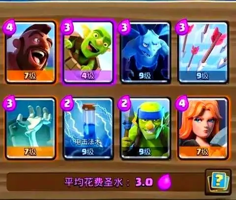 这套平民卡组包含野猪骑士、哥布林飞桶、瓦基丽武神、哥布林投矛手、亡灵、骷髅墓碑、万箭齐发以及电击法术。整体而言,这套卡组的平均圣水消耗仅为3点,其核心策略在于通过持续的进攻来给敌人施加压力,同时利用巧妙的防御和反击来掌控圣水的流动。这种战术能够有效地打乱敌方的防御布局,尽管这套卡组不追求三皇冠的胜利,但基本上能轻松以一或两皇冠的成绩告捷。