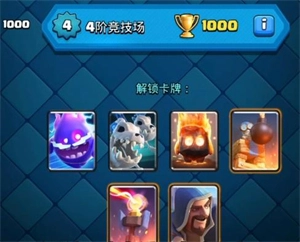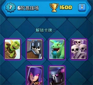 到了6阶就可以解锁史诗卡牌了,这时你的对手也会变强,可以尝试吧哥布林牢笼换成骷髅军团,之后就是一直打新的竞技场来解锁卡牌,可以选择冰雪精灵、闪电法术、吹箭哥布林等比较强力的卡牌。