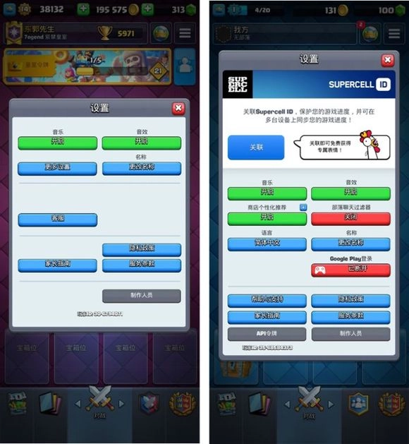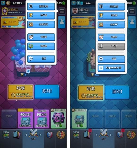 3.中英文翻译的不同,皇室TV改为了皇室频道,Supercell ID功能为国服与分服前渠道服均没有的功能(绑定suercell ID后即为国际服)。