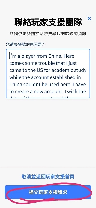 进入如下界面后,在框内填入你账号遗失的原因后,点击下图圈起来的位置。