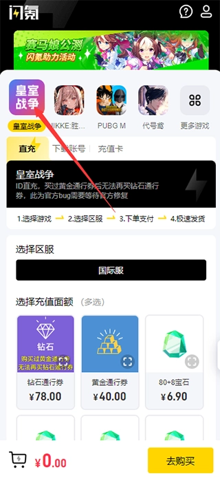 2、找到皇室战争国际服,选择自己想要充值的内容付费即可。