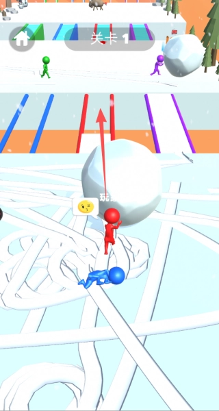 1、控制角色在雪地里推动雪球,雪球会持续吸附周围的积雪从而越变越大,等它达到特定大小后,就能通过红色通道开启下一轮挑战。