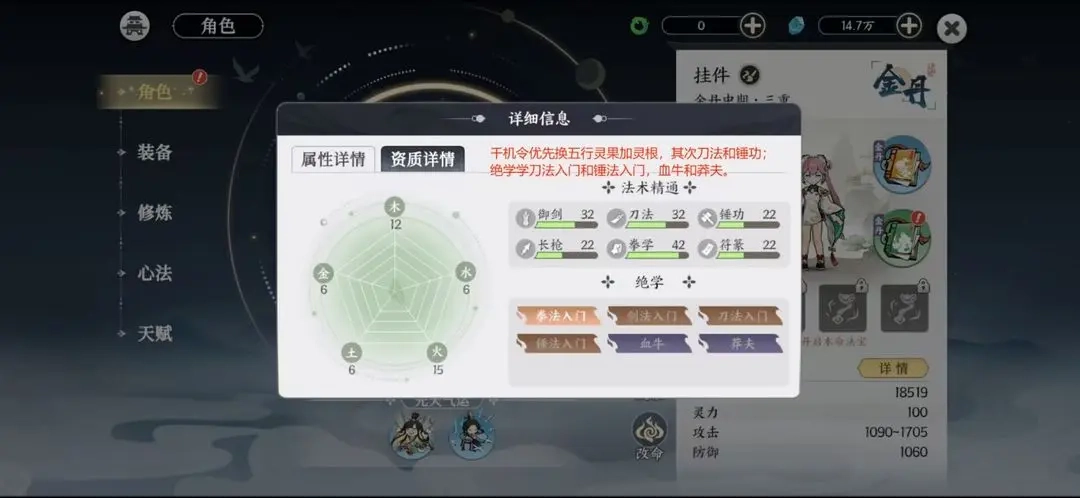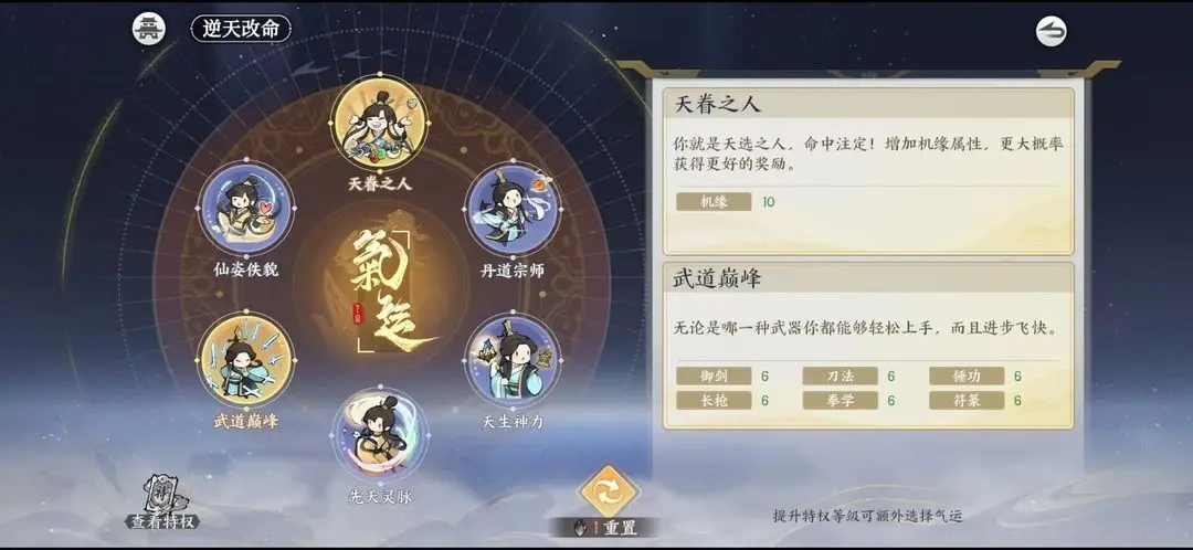 前期天运:优先选择“天眷”和“炼丹师”,能快速提升实力。到了元婴或化神期可考虑更换,第一次更换免费。