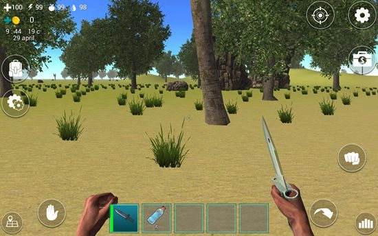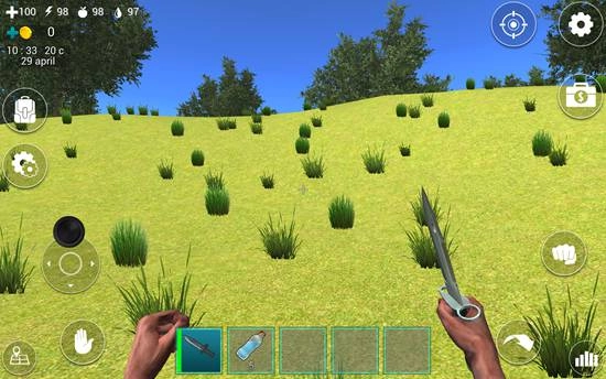 1. 上手操控毫无难度:屏幕下方的道具栏中放着一把匕首,只需轻点一下,就能把它牢牢拿在手里。而屏幕左上角的四个带数字的图标,会即时显示你的身体状况,包括血量、体力、饥饿度和口渴度,所有细微的变化都能清晰看到。