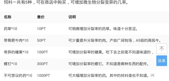 饲料共5种,商店购买,可增加微生物分裂变异几率。