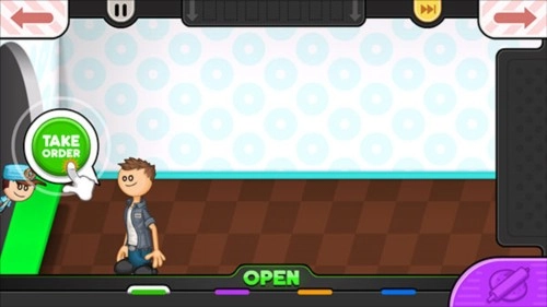 1、进入老爹的甜甜圈店游戏之后,我们先点击左侧的【TAKE ORDER】来为顾客点单。