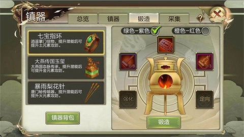 锻造配方,每件镇派之宝都分为【绿色-紫色】和【橙色-红色】两种配方,请各位少侠根据自己拥有的素材数量来选择适合的配方吧。橙色品质以上的配件在未装备时,是可以在寄售行进行交易的。配件的锻造属性是随机的,尝试获得最适合自己属性的配件。配件类型,每个镇器都由2-6个不同的配件组成,每次锻造所能获得的配件部件是随机的。还可以通过特殊锻造来就行额外的强化,打造自己心仪的配件。
