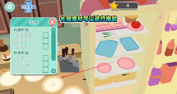 2、点击冰箱图标打开储物空间,长按所需食材并拖动至料理台准备进行处理