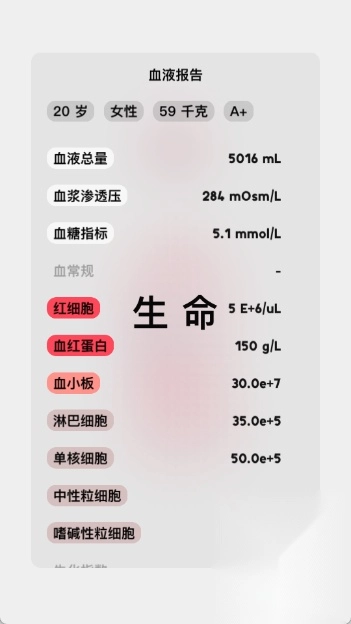 3.点击左下角血液图案,可查看详细的血液检测报告及具体标签的解释。