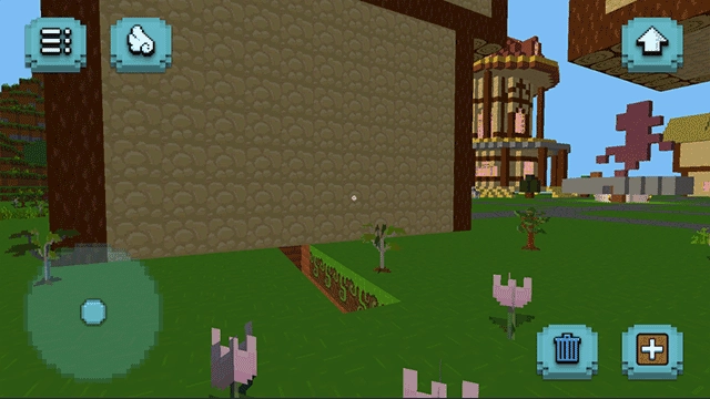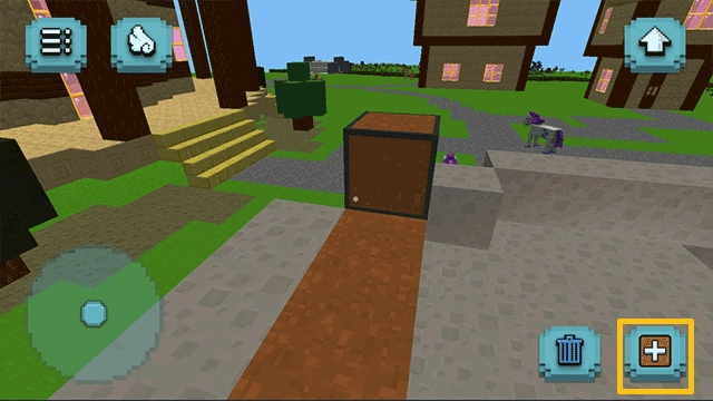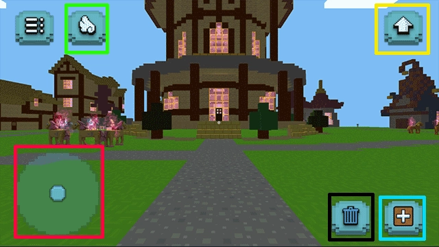 3.进入城镇,玩家就能通过屏幕左边红色方框内便捷的方向键灵活操控角色移动啦。为助力大家更完美地设计专属房屋,游戏还贴心设置了诸多实用功能:绿色方框内的选项宛如神奇魔法,轻轻一点,就能帮你自如切换飞行或走路状态;蓝色方框内的选项好似神奇的“积木制造机”,点击它可快速增加方块;黑色方框内的选项则像一把精准的“雕刻刀”,助你删除多余方块;而黄色方框内的选项如同灵动的弹簧,按下就能让小马欢快跳跃起来。