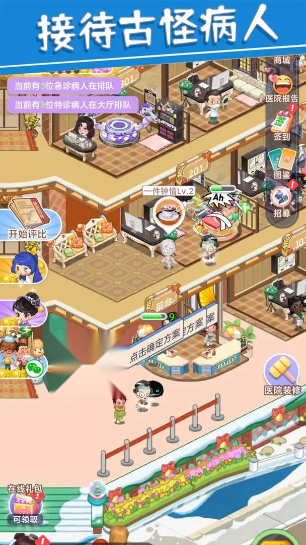 2.病人关怀与管理:面对游戏中的各类搞笑、离奇、魔幻病人,细心诊断,满足其特殊治疗需求,提升病人满意度。