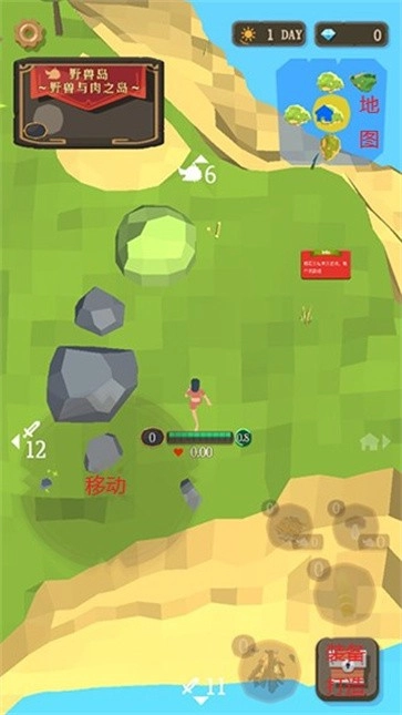 3、我们可以通过左下方的按钮控制角色移动,需要在野兽岛上寻找食物和材料,让自己生存下去。