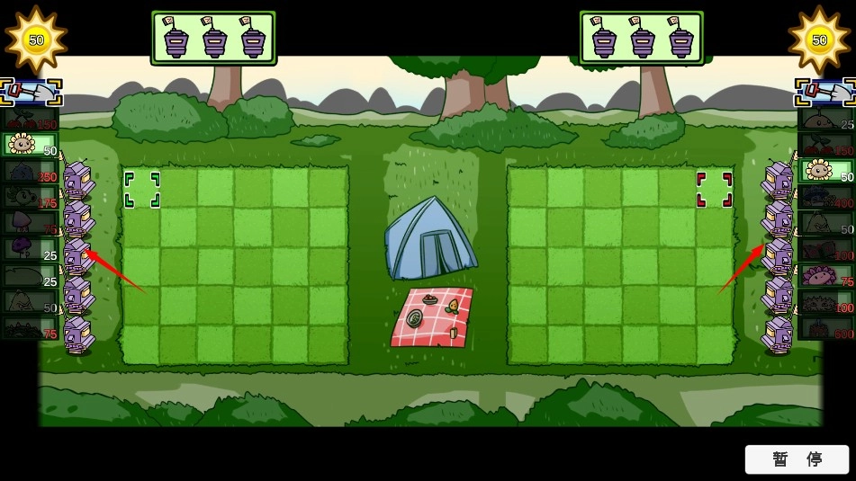3、选择好自己的植物,双方在各自半区放置植物进行对战