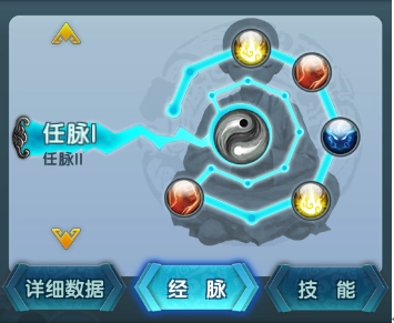 如下图所示:左边经脉列表显示当前侠客已打通和正在打通的经脉。而通过经脉气波牵引的右边,显示当前选择经脉具体穴位的打通情况;每个圆球表示一个当前经脉上的穴位。