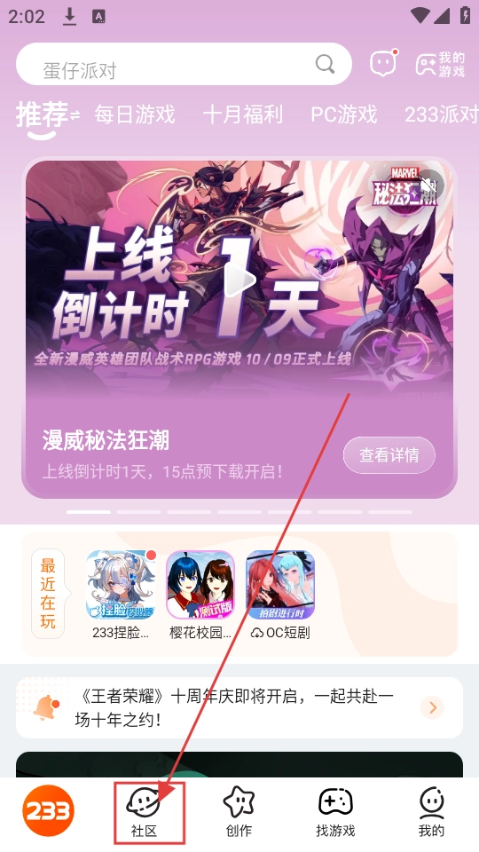 1、首先打开233乐园,然后在右上角的部位可以看见一个的箭头,点击进入;