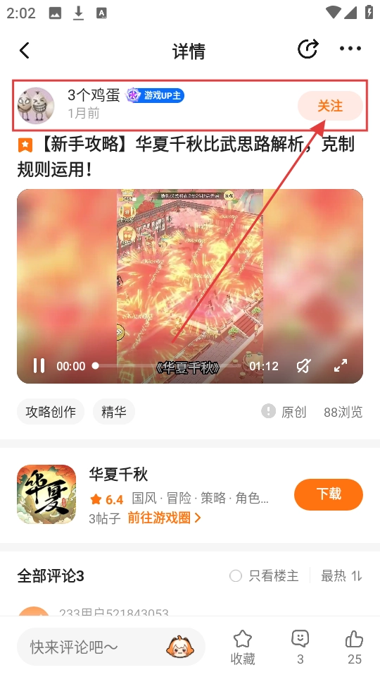3、遇到优质攻略作者,比如发【华夏千秋】攻略的,点【关注】,这样就能及时看到他新出的攻略啦。