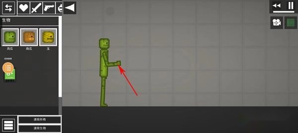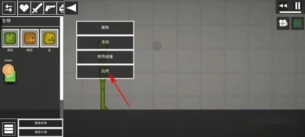3、然后将胳膊抬起,双击西瓜角色胳膊会出现删除、冻结、静置碰撞、启用,选择冻结,胳膊就会停住;