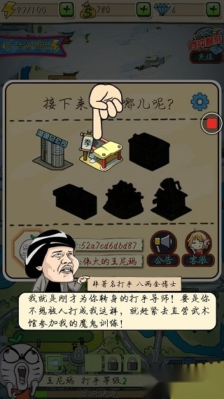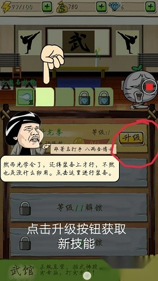 点击这个拳后里面会空荡荡的没有什么特殊技能与打人方式,首先从这里进行升级,每级的技能都会不同,需要靠你自己慢慢琢磨和打通关来获取。