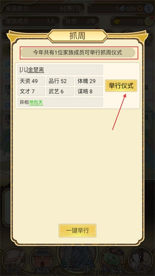1、家族成员抓周时,可查看【金楚离】的天资、品行等属性,选择举行仪式即可触发后续流程。