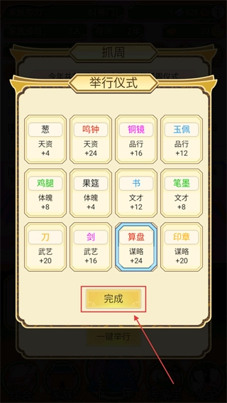 2、抓周仪式中,可以选择【鸣钟】【铜镜】等物品提升对应属性,选后点击完成确认操作。