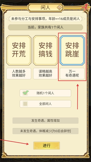 3、家族闲人可安排【开荒】【搞钱】或【跳崖】,跳崖有概率触发奇遇,选后点进行。