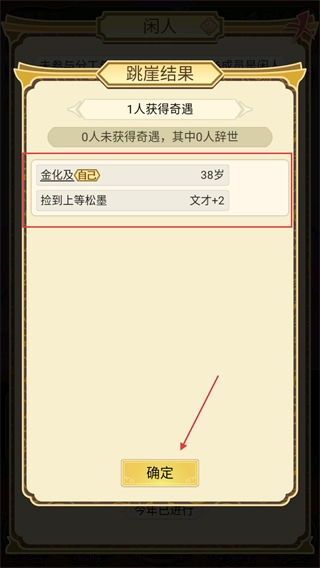 4、跳崖结果里,成员或获【上等松墨】等奇遇,如【金化及】文才加2,点击确定关闭。