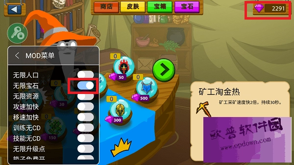 3、商城为例子,在里边点开,右上角的钻石就会无限增加,可以自由购买商品~其他功能战斗中也可以使用!