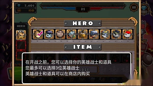 1、开战前,你可以挑选英雄战士与道具,最多能选3位英雄战士,英雄和道具可在商店中购买。