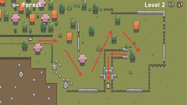 1. 第一关里,按照红色箭头的指示方向穿过围栏,同时注意角色的位置来开展探索