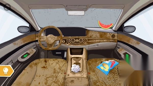 2、接着点一下左边绿色的按钮,继续清理座椅下的垃圾。副驾驶的抽屉打开,里面的垃圾也要清理,可以用蓝色吸尘器吸