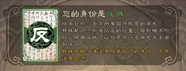 在游戏中,玩家需要扮演不同的身份,包括主公、忠臣、反贼和内奸,每个身份都有不同的游戏目标。主需要与忠臣合作,消灭所有的反贼和间谍;忠臣需要保护主,帮助主消灭反贼和奸细;反贼需要摧毁主才能获胜;叛徒需要消灭反贼,然后消灭忠臣和主。