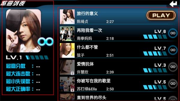 进入游戏后点击屏幕就能进入主界面。左边区域会显示玩家的等级、最高得分、最大连击数和最高准确率等信息,右边是歌曲列表。刚开始只能玩第一首歌,等等级提高了,会有更多歌曲解锁。
