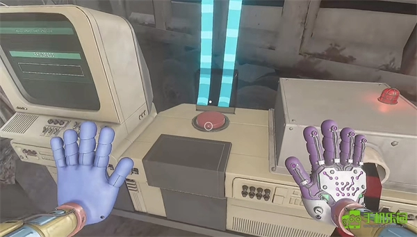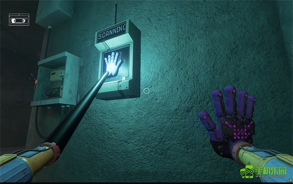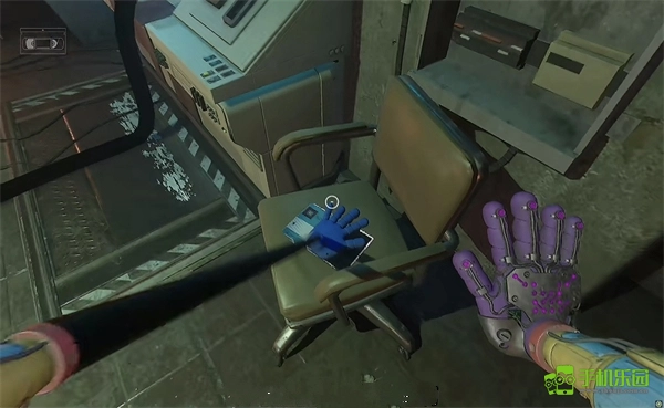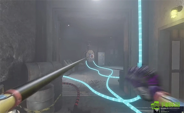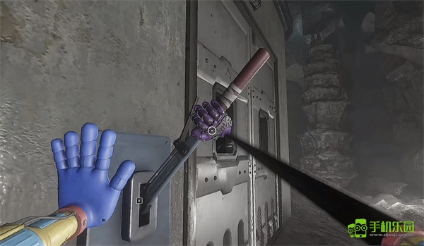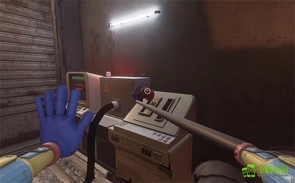 6、打开门后往里走,还会看到一个开关,需要把它拉下来。继续往前走,用蓝色手臂去互动前方的开关,这里得触发三个开关,才能让电流打通出口。